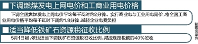 会议决定,为降低企业成本、稳定市场预期、促进经济增长、有扶有控调整产业结构,适当下调燃煤发电上网电价和工商业用电价格。一是按照煤电价格联动机制,下调全国燃煤发电上网电价平均每千瓦时约2分钱。二是实行商业用电与工业用电同价,将全国工商业用电价格平均每千瓦时下调约1.8分钱,减轻企业电费负担。继续对高耗能产业采取差别电价,并明确目录,加大惩罚性电价执行力度。三是利用降价空间,适当疏导天然气发电价格以及脱硝、除尘、超低排放等环保电价的突出结构性矛盾,促进节能减排和大气污染防治。