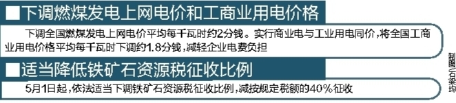 为改善铁矿石企业生产经营环境、促进结构调整、支持上下游产业协调发展和升级、保障国家资源供应安全,会议决定,自5月1日起,依法适当下调铁矿石资源税征收比例,减按规定税额的40%征收。