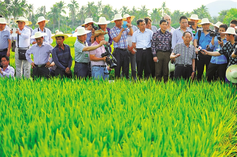 “三亚光照强,水稻生长期短。”抚摸着“超优千号”饱满的稻穗,袁隆平院士向参观者介绍了海南三亚和湖南长沙“超优千号”对比生长情况,三亚种植的“超优千号”生育期140天,株高1.05米,叶片14片,而长沙种植的“超优千号”生育期为150天,下转A02版▶
