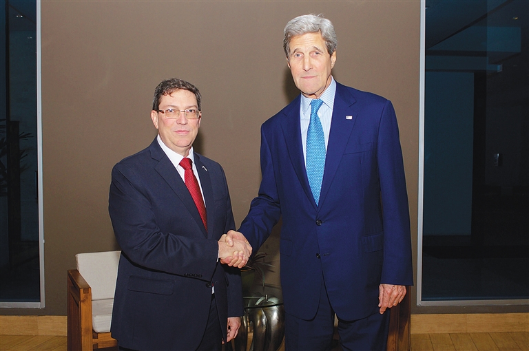 新华社巴拿马城4月9日电(记者叶书宏 毛鹏飞)美国国务卿克里与古巴外长布鲁诺·罗德里格斯9日晚在巴拿马首都巴拿马城会晤,这也是两国断交半个多世纪以来举行的最高外交级别会晤。