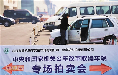 这是北京丰台区旧机动车交易市场内的拍卖会标识。 4月11日,第八场中央公车拍卖在北京旧机动车交易市场举行,110多辆公车参与拍卖,近200人参与竞拍。 自第5场拍卖会以来,中央公车拍卖预展持续遇冷。第5场仅有200多人报名,第6场394人,第7场290多人,均未达到拍卖方限定的500人。业内人士分析,经过此前几场火爆的拍卖,人们的认识趋于理性;而部分公车的成交价相较同等情况二手车的市场价偏高。 截至目前,中央层面公车拍卖会已举办七场,共有761辆车成交,8辆车流拍。根据中央和国家机关本级共取消3184辆公务用车的数量计算,尚有2000余个拍卖机会。新华社记者 李欣 摄