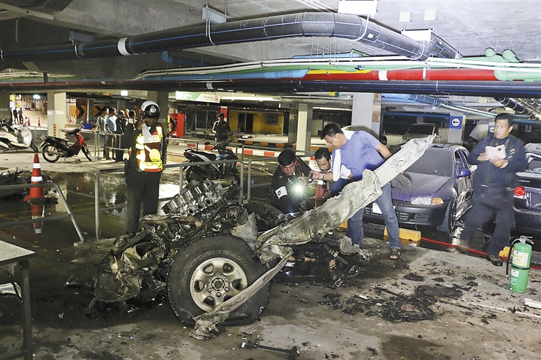 4月10日,在泰国旅游胜地苏梅岛,警察在一家商场地下车库发生爆炸的现场展开调查。 泰国警方11日说,旅游胜地苏梅岛一家商场的地下车库10日发生汽车炸弹爆炸事件,6名泰国人和一名12岁的意大利少女受伤。 新华社/路透