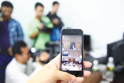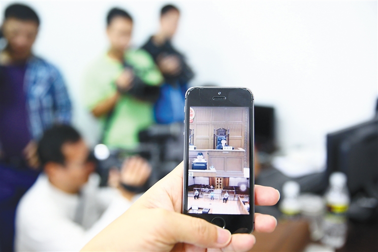 图为工作人员展示手机上观看庭审现场。