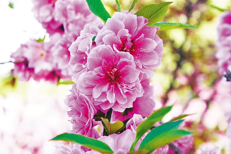 一大片云蒸霞蔚立时闯入双眸,视线所及的底色都染成了粉红。果然人间四月天,百般红紫不复早春时的含羞带涩,一树树,一丛丛,一枝枝,一朵朵,一片片旋开了最绚烂的裙裾,呐喊着生命的高蹈。道路两旁的花树伸展出纤长的枝条,无一处不被簇拥着的花朵挤满,宛如万千朵粉蝶攒成的长长绒条。微风过处,纵然是“千朵万朵压枝低”,也随之懒洋洋摆动,拂过游人竞相指点的手指,拂过赏花人笑意盈然的脸颊,是带着些微暖意的润。也有花香,在暖阳下氤氲、弥散、蒸腾,仿佛从你身上的每个毛孔渗入,一会儿功夫,俨然一个香喷喷的人啦!