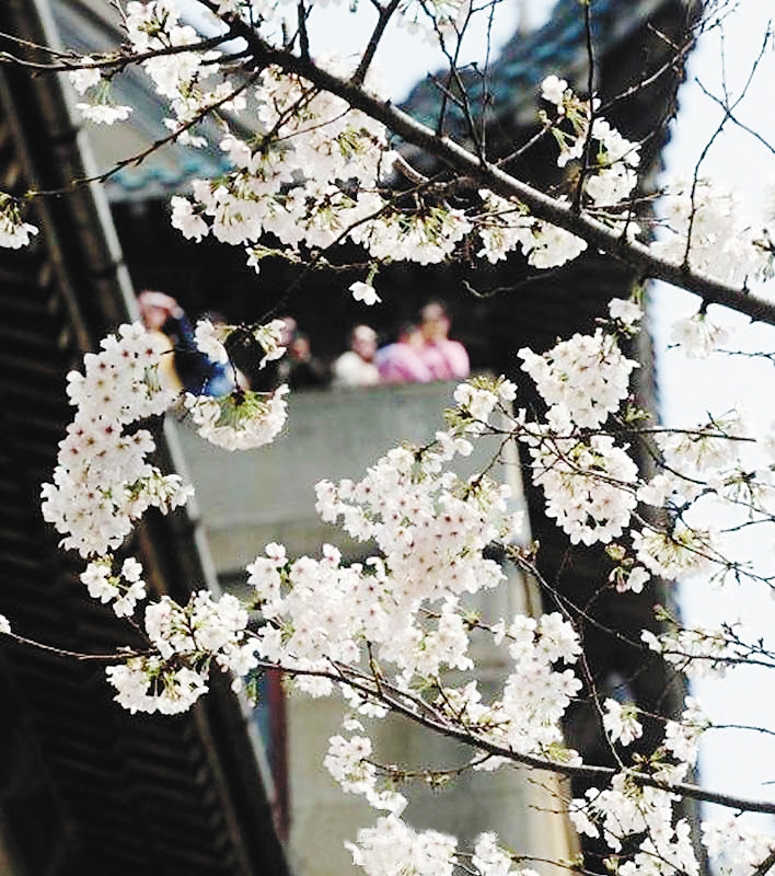 当我们随着游人赶往樱园,沿着樱花大道行走,没有看到期望中花环锦簇,繁花似锦,挂满枝头的景象,只看到樱树枝条已抽出绿叶,粉白色樱花花瓣散落地面,枝条上花朵稀疏可见。想必樱花大道两旁是早樱,早樱花期早,先花后叶,开花时基本不见叶子。花蕾粉色,卵圆形;花粉白色,花瓣5枚,花瓣尖内凹,花瓣边缘有红晕;雌蕊1个,雄蕊散射,有长有短,长的雄蕊略长于花瓣,花丝浅紫红色;花萼浅紫褐色,筒型有毛,萼5片,顶略尖,另常有萼瓣1个;花梗长约0.5cm,有毛;花2~3朵一束,稀1朵;花谢后花瓣脱落,但花丝还能宿存几天,远望之如红云一片。听友人说,前几天刚有两场春雨,打落了花瓣,枝头已抽出了嫩叶。道路旁摆卖小礼品的勤工俭学的学生告诉我们,春雨敲落四朵樱花才长出一片绿叶。我们无从求证,但毫无疑问,早樱盛开的樱花大道,想必是这样一番胜景:花枝浓密,抬头只见花不见天,仿佛进入一个晶莹透亮的世界;漫步樱花大道,放眼望去,雪白的樱花挂满枝头,仿若云海,微风吹过,落樱缤纷,好似在下樱花雨,一派人间奇景!