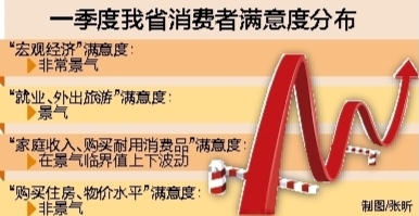 数据显示,我省居民对“宏观经济、物价、房价、就业、收入、耐用消费品、旅游”等七个子项满意度呈明显阶梯状分布,即“宏观经济”满意度持续超高位运行,“就业、外出旅游”满意度平稳运行于景气区间,“家庭收入、购买耐用消费品”则在景气临界值上下波动,而“购买住房、物价水平”满意度则长期处于非景气区间。