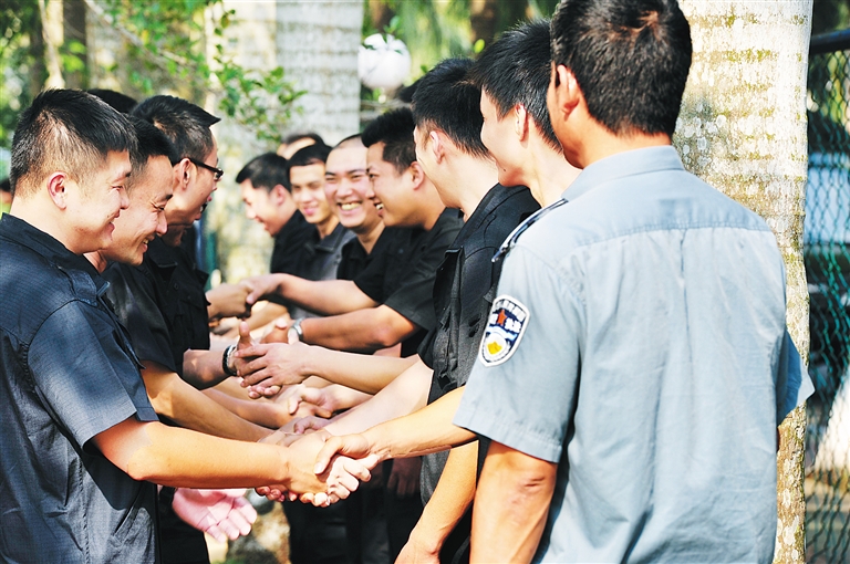 14日下午,海南政法学院操场上来自琼山区的100名城管队员正在教官指导下进行握手式、拥抱式、谈话式等文明和谐执法素质的训练。据介绍,集训旨在提高执法人员熟练掌握城市管理法律法规等业务知识和采取灵活有效的执法方式方法。