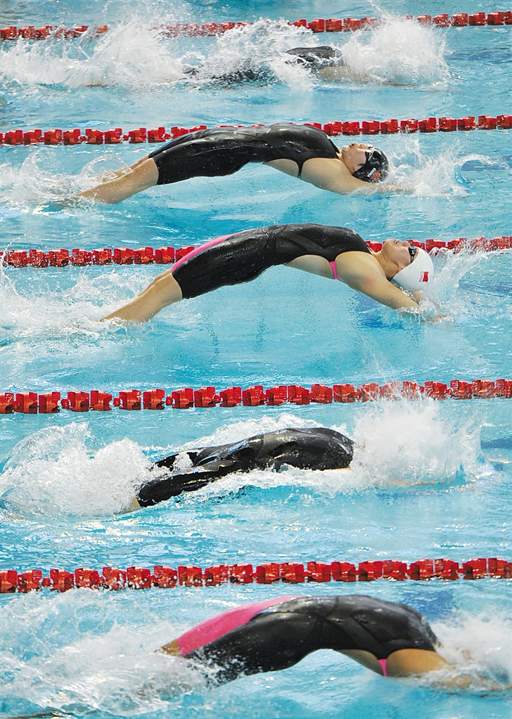 女子200米仰泳决赛爆出冷门,脚腕受伤的仰泳名将傅园慧最终名列第四,成绩为2分10秒36,比起自己年初在珀斯四国赛游出的2分08秒84有所差距。奥运冠军叶诗文摘得铜牌。夺冠的湖北队陈洁成绩为2分09秒64,该成绩列今年世界第11位。