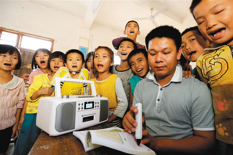 据介绍,今年英均村小学分到了6台语音教学设备,用于辅助老师的教学工作。现在学生在课堂上能听到标准的国语课文朗读,可以有效地矫正他们的普通话发音。