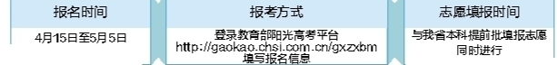 省考试局有关负责人介绍,报考该专项计划的考生须于4月15日至5月5日在教育部阳光高考平台( http://gaokao.chsi.com.cn/gxzxbm)填写、提交报名申请信息。6月3日前,有关高校确定参加学校考核考生名单并进行公示,考核录取工作管理参照高校自主招生办法执行,详见各招生院校招生章程的规定。高校考核、确定入选资格考生名单等工作在高考后、高考成绩公布前进行。