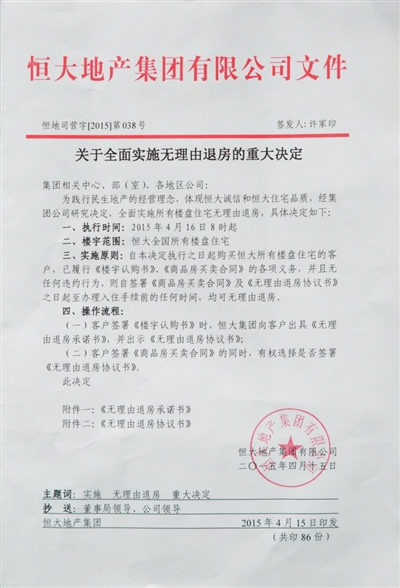 当天的活动现场,恒大集团方面表示,从4月16日8时起,凡购买恒大全国所有楼盘住宅的客户,已履行楼宇认购书、商品房买卖合同的各项义务,并且无任何违约行为的,自签署无理由购房合同起,到办理入住手续前的任何时间,均可申请无理由退房。