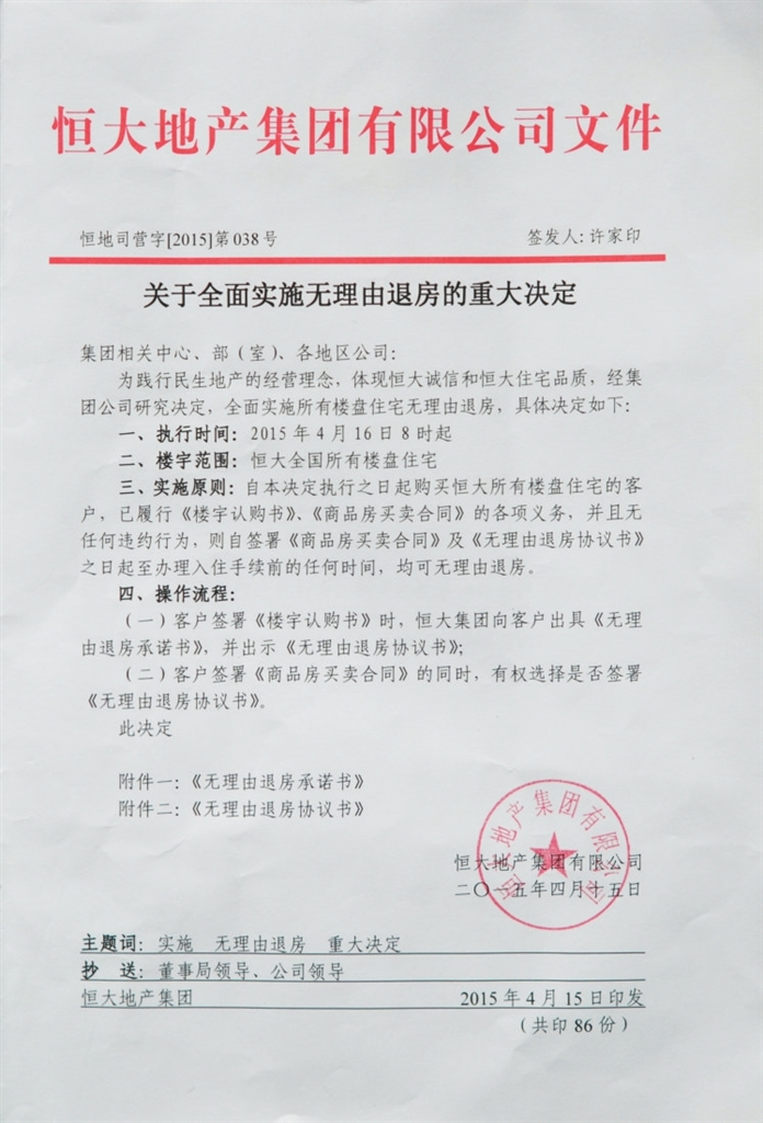 根据恒大集团的一份《关于全面实施无理由退房的重大决定》显示,从4月16日8时起,凡是购买恒大所有楼盘住宅的客户,已履行《楼宇认购书》《商品房买卖合同》及《无理由退房协议书》之日起至办理入住手续前的任何时间,均可无理由退房。