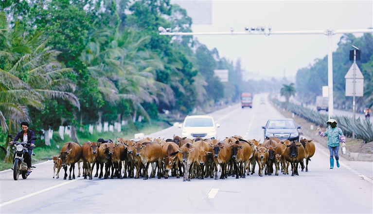 4月15日,在洋浦经济开发区附近的一条公路上,村民将牛群从交通摄像头下赶过公路,可是由于牛群行走缓慢,给过往的车辆带来一定的麻烦,车辆不得不等牛群走过才能通行。一些车主开玩笑说,车辆超速摄像头会拍照,可是牛群行走太慢摄像头会拍照否?本报记者 陈元才 摄