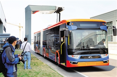 4月16日,一辆十秒闪充纯电动公交车在站台的充电桩上充电。 当日,中国南车株洲电力机车有限公司全球首创的十秒级闪充超级电容储能式现代电车在宁波生产基地正式下线。十秒闪充纯电动公交车无须架设空中供电网,只需在公交站点设置充电桩,利用乘客上下车30秒内即可把电充满并维持运行5公里以上,可在线循环往复运营。 新华社发