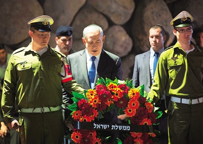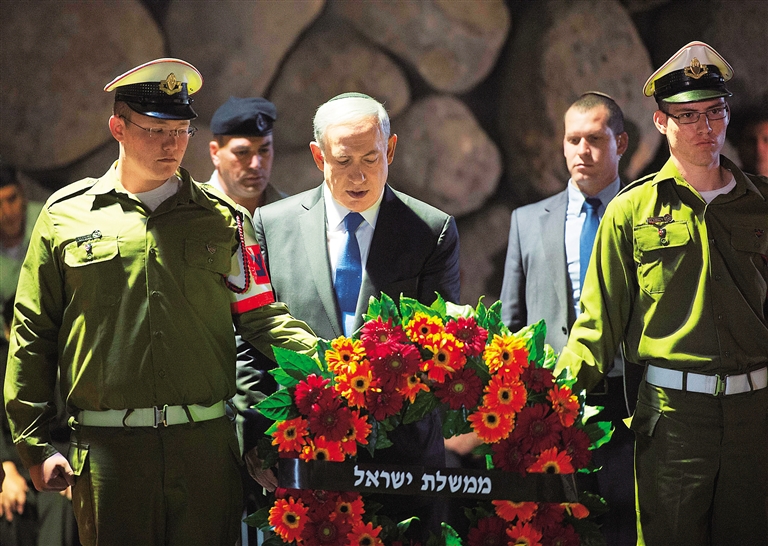 4月16日,在耶路撒冷的亚德韦希姆大屠杀纪念馆,以色列总理内塔尼亚胡(中)向大屠杀遇难者敬献花圈。 以色列总统里夫林和总理内塔尼亚胡当日前往亚德韦希姆大屠杀纪念馆敬献花圈,悼念第二次世界大战中的犹太人死难者。以色列大屠杀纪念日根据犹太历法确定,今年的纪念日自4月15日日落开始,至16日日落结束。今年的主题是“痛苦的解放和重返生活——二战结束70年”。 新华社发(阿莫斯·本·格尔肖姆摄)