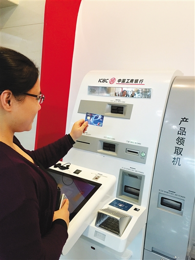 陈女士在手持iPad的工作人员引导下,往智能柜员机插入身份证后,机器就自动扫描信息,同时摄像头已经在为她照相;输入交易密码,并在触摸屏上留下电子签名,智能柜员机吐出一张凭条,她拿着凭条就可以到产品领取机上领取卡和U盾,全程仅花去2分钟。(左图:金荣 摄)