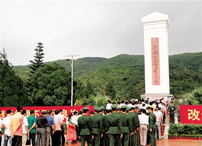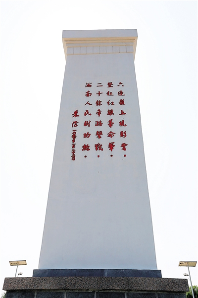 面朝着青山,六连岭烈士纪念碑浮雕着朱德所题的《六连岭》诗句。那是1957年1月,党和国家领导人朱德在海南视察工作时,被六连岭根据地军民艰苦卓绝的斗争深深打动,即兴赋诗:“六连岭上现彩云,竖起红旗革命军。二十余年游击战,海南人民树功勋。”