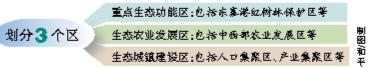 《大纲》从维护人居环境健康角度出发,依据海口不同地区在生态环境结构、状态和功能上的差异,充分与主体功能区的划分相衔接,划分为重点生态功能区、生态农业发展区、生态城镇建设区三个区。其中重点生态功能区包括东寨港红树林保护区等,生态农业发展区包括中西部农业发展区等,生态城镇建设区包括人口集聚区、产业集聚区等,是区域城市化和产业发展的核心区域。