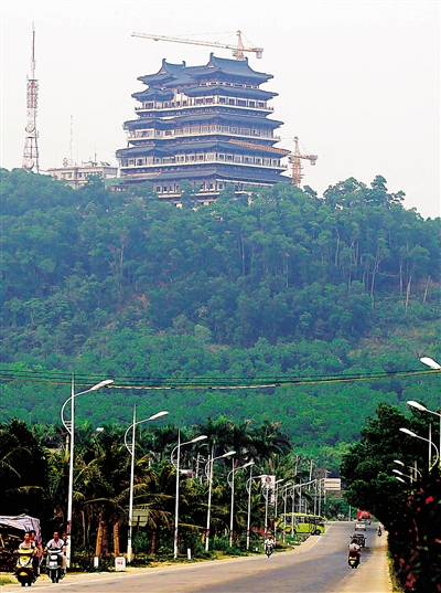 儋阳楼落成在即。时值九九重阳,携友欣然登楼。信步云天,心旷神怡。遥望松林岭,苍山横黛,薄雾缭绕;俯视云月湖,烟波浩淼,碎金万点。身处如此良辰美景,不禁怀古而思今:儋州虽地处孤岛蛮荒,盖天钟秀于是,东坡遗风,白衣传道,自古弦歌不辍,人才辈出;而今新建儋阳楼,增添人文胜景,赓续文化薪火,实为西部中心城市文化建设之幸事。堪称古有载酒堂,今有儋阳楼。应张琦先生之嘱,不顾笔拙,撰成二联,以贺落成之喜。
