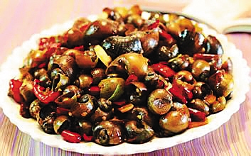 酿田螺是广东菜,做起来费工夫,吃起来却如老虎吃虾米。把螺肉挑出,与猪肉、香菇等斫碎拌匀,重新入壳蒸之或煨之,拖汤带水,鲜美异常。