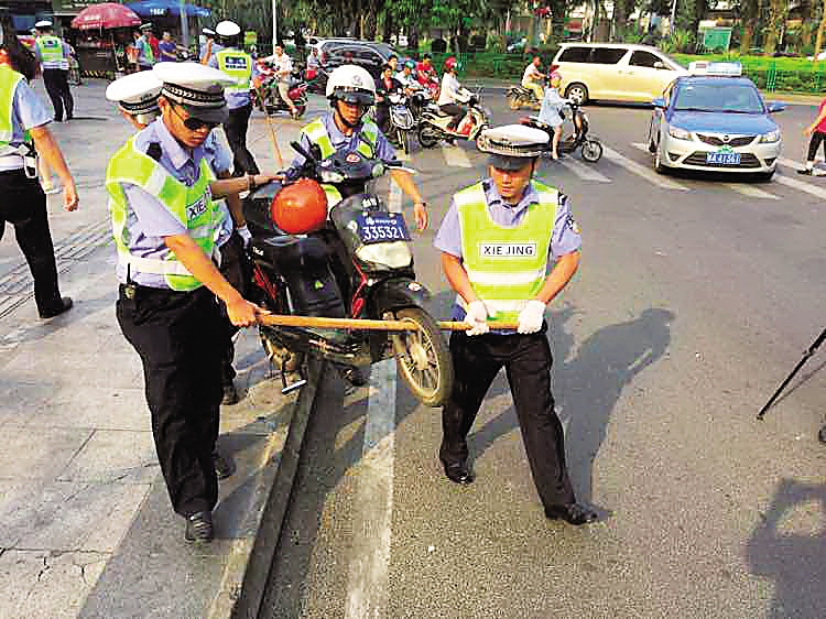 据悉,海口市公安局交警支队所属四个辖区大队分别对秀英区港丰农贸市场、美兰区文明东路华山大厦、琼山区红城湖路家乐福超市门前路段、龙华区龙华路海医广场、龙昆南路和信广场门前占用人行道违章停车违法行为进行了清理。