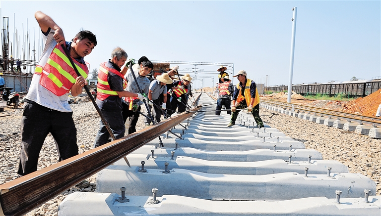 “一二一二一二……”20多名工人用撬杆发力撬动25米长的钢轨,缓缓位移,当移至轨枕准确位置,工人拧紧钢轨螺帽。“眼下西环高铁施工工期紧,我们得加班加点干。”铺轨工人张先高抹了一下额头上的汗珠,又忙了起来。