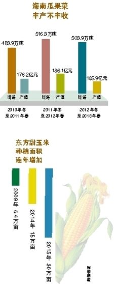 海南省农业厅统计数据显示:2010年冬至2011年春,海南岛瓜果菜出岛483.9万吨,产值176.2亿元;2011年冬至2012年春,这个数字是516.3万吨和186.1亿元,到了2012年冬至2013年春,瓜果菜出岛503.9万吨,产值165.9亿元。相比2011年,2013年产量的提升却并没有带来产值的提升。