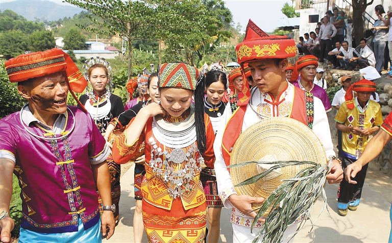 祭祀活动结束后,黎族苗族婚庆展示活动也在水满乡进行。黎族杞方言传统婚礼共分下聘、接亲、送娘、迎亲、入门、婚宴等环节,苗族传统婚俗礼节分说亲、合命订婚、聘礼、迎亲、合配、拦路抢亲、婚宴等几个环节进行,她们穿着民族服装,群众广泛参与,非常热闹,游客能够近距离感受到传统黎族苗族婚礼的乐趣。