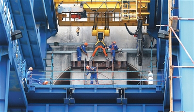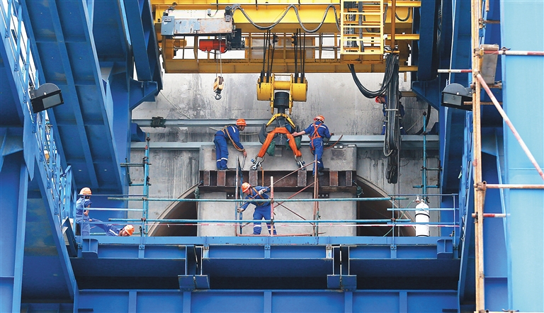 今天下午1时半,阳光开始穿透云层照到地面,核岛和常规岛的影子清晰地投射在地面上。紧挨着昌江核电工程1号机组核岛搭建的数十米高的龙门吊上,施工单位——中国核工业二三建设有限公司十几名员工头戴橙色安全帽、身着统一的蓝色工作服在安装设备。