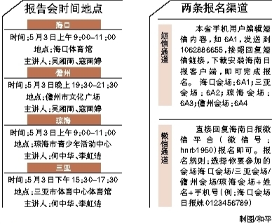 记者今天从海南日报客户端获悉,5月3日,龙泉集团·“美在心灵”首届海南籍优秀大学生励志报告会将于5月3日分别在海口、三亚、琼海、儋州四市县举行,报告会不对观众收取任何费用,唯一门槛是需要出示下载安装海南日报客户端的智能手机(海南日报客户端下载地址 http://cgi.hndaily.cn/3g/pc/,一端一票),广大家长和中学生可踊跃报名。