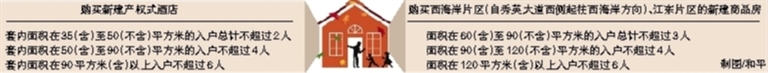 购买西海岸片区(自秀英大道西侧起往西海岸方向)、江东片区的新建商品房面积在60(含)至90(不含)平方米的入户总计不超过3人,面积在90(含)至120(不含)平方米的入户不超过4人,面积在120平方米(含)以上入户不超过6人。