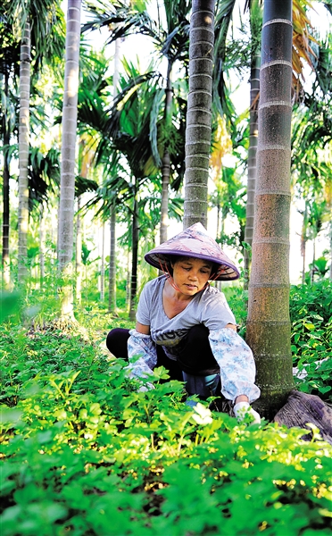 4月20日,工人在屯昌立平野菜种植基地的村庄槟榔林里察看套种野菜生长情况,数百亩套种的野菜,长势喜人。目前该基地每天出岛野菜上千斤,销往京广沪等全国各大城市,每年收入超过千万元。