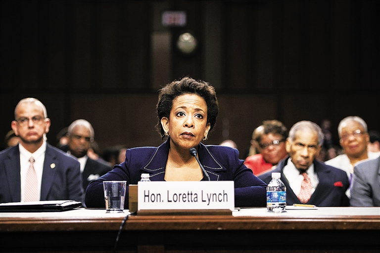 美国参议院4月23日以56票对43票表决通过,确认洛蕾塔·林奇接替埃里克·霍尔德担任司法部长一职。林奇由此成为美国历史上第一位非洲裔女司法部长。 这是林奇1月28日在美国华盛顿出席听证会的资料照片。 新华社/法新