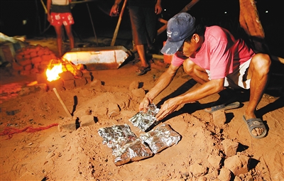 除了清水煮,临高人吃海鲜还有一种独特的烹饪手法——土窖海鲜,即将泥土块烧热,再将滚烫的泥块砸碎覆盖在用锡纸包好的食物上面,利用泥土的热度烹熟食物。这种做法减去了煎炒油炸的油腻,又保持了原汁原味的营养和口感,风味独特,深受消费者青睐。