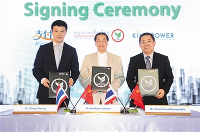 4月27日,在泰国曼谷,支付宝东南亚地区总监张大勇(左)、开泰银行董事长伍万通(中)和王权集团董事长威猜·诗瓦塔纳巴帕出席签约仪式。 当日,泰国开泰银行、支付宝和王权集团举行签约仪式,联合推出免税商品网购服务。自28日起,中国近9亿支付宝用户就可以在泰国最大的免税商店——王权集团的官方网站上直接进行消费。 新华社发