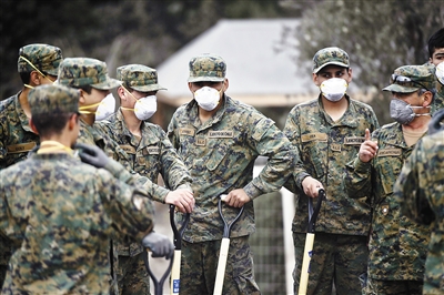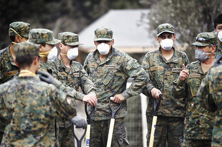 4月26日,在智利蒙特港附近的恩塞纳达镇,智利军人准备协助当地居民清理火山灰。 智利中南部地区的卡尔布科火山4月22日突然喷发,很快形成了几千米高的火山灰柱。该火山在周末较为平静,但是智利政府称,卡尔布科火山有可能再次喷发。