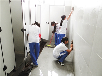 全校所有班级打扫时间全部排表公布,男生负责男生厕所,女生负责女生厕所,每个班再具体分成小组负责各个厕所。每个班每天各个卫生间的打扫成绩,由学校政教主任每天三次检查打分张贴公布、评比。“冲洗厕所”的社会实践成绩,进入学生成长档案。