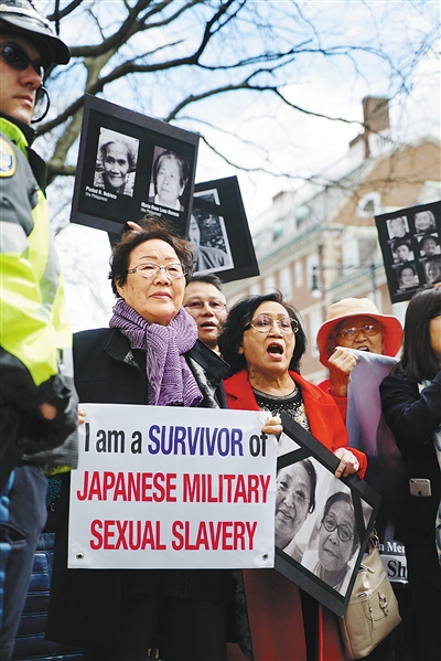 正在美国访问的安倍当天在哈佛大学发表演讲。演讲厅外,包括哈佛大学学生和韩裔美国人团体成员在内的抗议者手举标语,高喊口号,要求安倍停止否认历史事实,明确就日本军队二战暴行道歉。