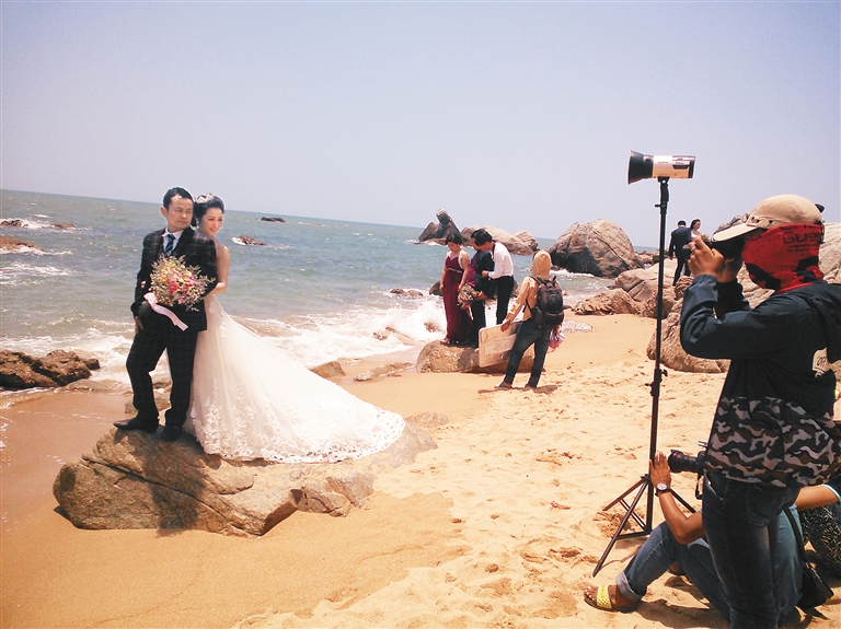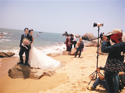 4月26日,仅在三亚湾某婚纱摄影外景地,前来拍摄婚纱的新人就多达60多对。“世界那么大,为爱三亚”,湖南来的一对新人告诉记者,飞来海南拍婚纱,不仅是因为这里的椰风海韵、碧海银沙,还为了爱到天涯海角、爱到地老天荒的寓意。本报记者 郑彤 摄
