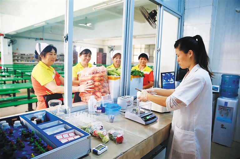 4月27日,在海口山高学校,化验师正在该校食堂的食品安全快速检测室里,检测学校食堂购进的蔬菜小样,一边检测一边做着详细的记录,最后录入系统,并进行食品安全日报公告。据了解,该校每天都会对购进的每一个批次的食品原材料进行检测,检测项目包括农药残留、甲醛、苏丹红、病害肉等10余种,以此确保食堂食品安全,从源头上消除校园食品安全隐患。本报记者 张杰 摄