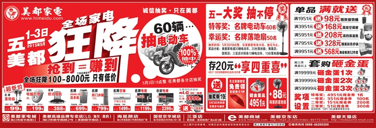 【购物抽60辆电动车】4月24-5月3日,在美都家电各分店购满200元即有机会中大奖!60辆名牌电动车,50台名牌落地扇,美都大奖今夏给力,现场由您抽,100%抽中幸运的您一定要来哦!(美都各分店邀您见证,详请见店内海报)
