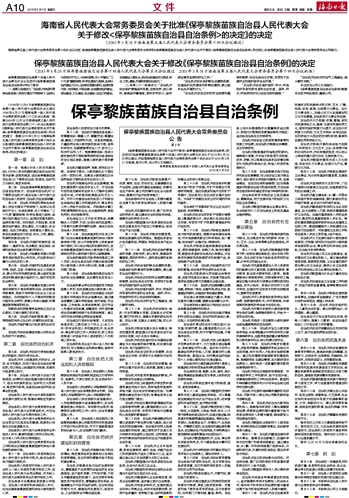 保亭黎族苗族自治县人民代表大会关于修改《保亭黎族苗族自治县自治条例》的决定