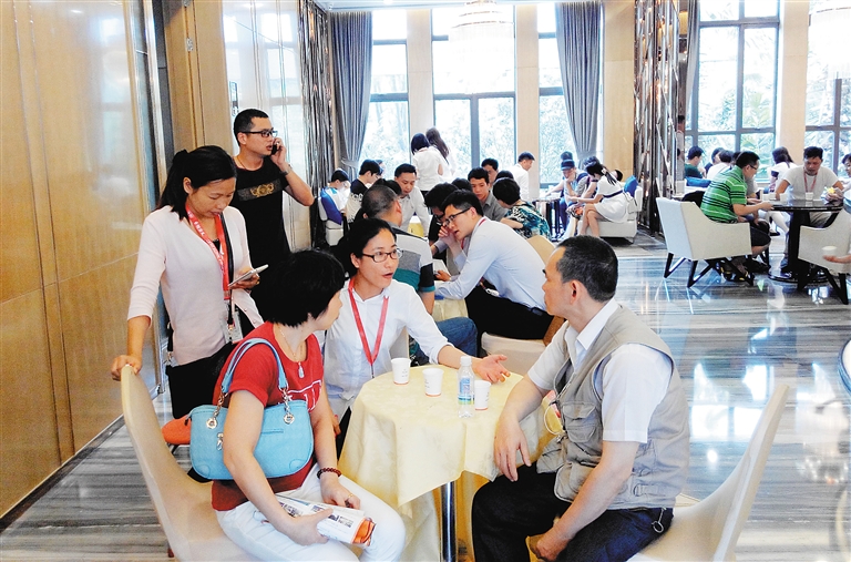 5月2日,市民在广州某江景楼盘售楼处洽谈。 “五一”小长假期间,广州不少楼盘人头涌动。广州市国土资源和房屋管理局官网数据显示,“五一”前夕,广州10区2市共有20个楼盘拿到预售证,为“五一”广州楼市新增4948套住宅房源。