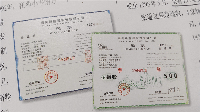 这是一张海南新能源股份有限公司纸质股票,每张500股。对于如今的股民来说,由于已采取电子化交易,根本看不到股票的样子,所以会显得特别新奇,进行买卖转让时,必须在其中进行背字。该公司是海南省第一家上市的股份公司,也是深圳证券交易所第一批异地上市公司之一。由于是我国第一家由民营企业改组的上市公司,1991年进行股份制改组并发行股票时,由于观念的问题而备受冷落。记得当时,该公司负责人拿着股票到报社来推销,费了很大的口舌,才让一部分人将信将疑地买下来,笔者也是其中之一分子,当时怀着矛盾的心态买了1000股。1992年11月23日上市之前,不少同事,由于担心成为废纸而平价转让他人,上市后不久最高涨到40多元,这些人的懊恼自不待说,笔者在22元多时也全部卖掉,赚了2万多元,这笔“横财”,让我兴奋了好几天。