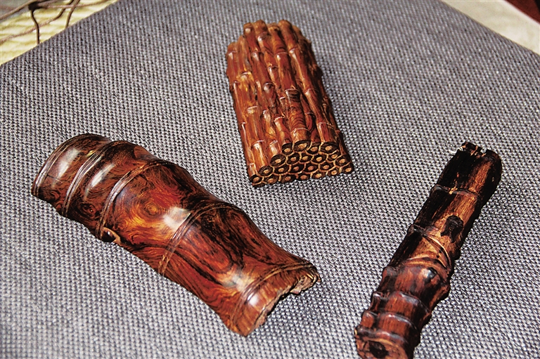 “野生状态下生长的海南黄花梨如今越来越少,市面上已不可多得,只有通过充满文化元素的雕刻和设计才能将海黄老料的生命意义延续下来。”陈先生表示,就目前海黄老料的保存现状来看,已经到了将要消耗殆尽的地步,再用海黄老料来做家具等大件藏品显然已经不可能,而在小巧精致的文房用品上,却有很大的发挥空间。