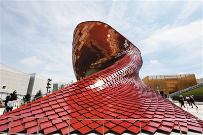 一片黄色花海中,中国国家馆仿佛层层麦浪起伏连绵,恢弘的气势吸引游人驻足。步入馆内,首先映入眼帘的是齐民要术、稻作文化、哈尼梯田、桑蚕文化、茶文化、北京烤鸭、杂交水稻、农业物联网等展览项目,它们通过视觉、听觉和触觉等最直观的方式展示中华灿烂的农耕文化。拾级而上,色彩变幻的巨幅光影麦田伴随轻柔的音乐在游客面前徐徐展开。最吸引人的当属循环播放的中国馆核心影片《团圆》,不少游客不惜排队等上30分钟观看。