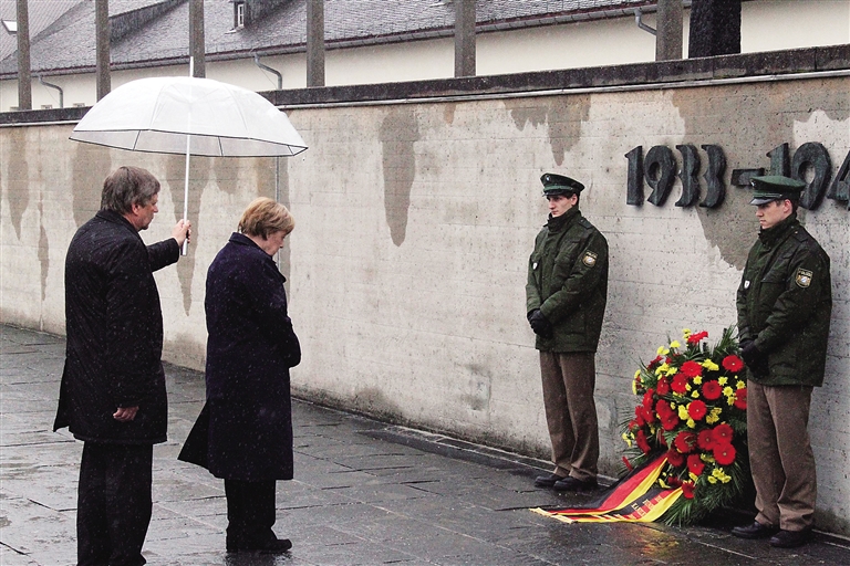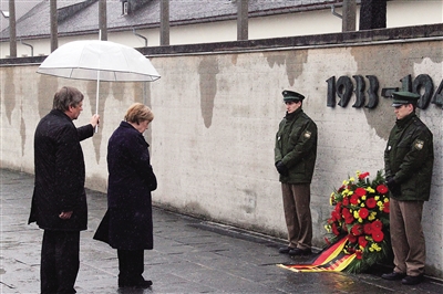 在纪念仪式结束前,默克尔向达豪集中营的死难者敬献了花环。
