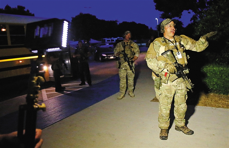 5月3日,在美国得克萨斯州达拉斯东北部加兰市,警察引导民众疏散。 美国得克萨斯州北部城市达拉斯附近地区当日发生一起枪击事件,两名枪手驾车抵达达拉斯东北部加兰市的一个社区中心后,向一个正在举办漫画比赛的社区中心开枪,打伤了1名现场的保安人员。两名身份不明的枪手被警方击毙。 新华社/路透
