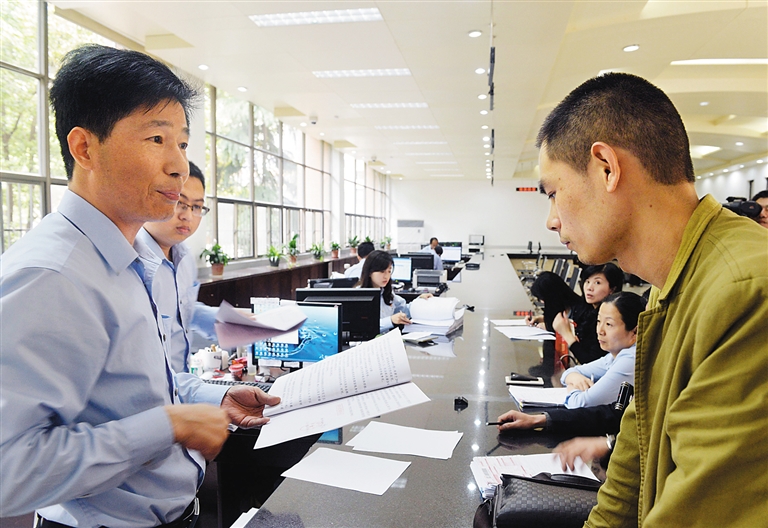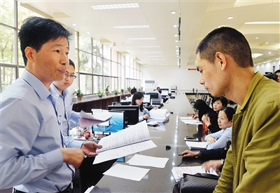 5月4日,安徽省蚌埠市中级人民法院诉讼服务中心工作人员向当事人介绍立案登记制度。 当日是我国法院实施立案登记制后的首个工作日,各地法院增开立案窗口、增配立案工作人员接待诉讼群众。 新华社发(高建业 摄)