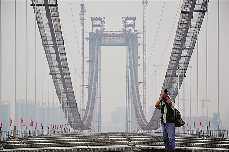 5月5日,一名摄影爱好者在顺利合龙的葛洲坝至喜长江大桥主桥上拍照。 当日,“万里长江第一坝”葛洲坝坝上公路替代用桥——至喜长江大桥主桥顺利合龙。这座大桥是继武汉鹦鹉洲大桥后,世界上第二座开建的钢板混合梁悬索特大桥。 大桥的建设,对于缓解宜昌市城区过江交通压力、拓展城市空间、完善城市路网布局,以及推进宜昌长江中上游区域性中心城市和现代化特大城市建设具有重要意义。新华社发